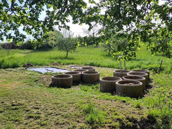 Il a fallu faire avec les contraintes actuelles – outils, temps, saison avancée, mais nous avons pu dégager les quelques buses présentes sur le terrain pour les utiliser. Afin de commencer à comprendre la terre, il était intéressant également de préparer une petite surface, pas trop loin de la maison, pour faire quelques tests de graines, d’arrosage, et de compatibilité (entre plantes, et avec la terre).