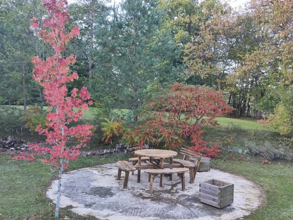 - La table ronde a été démontée, réparée, poncée et huilée. Elle est maintenant toute fringante, et a retrouvé sa robustesse : on peut s’assoir sur les bancs sans faire une prière, au moins.